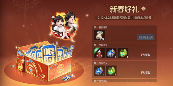 2月12日到23日期间,只要累计签到4天就可以直接领取198限时点券及元流之子全新的时装皮肤。