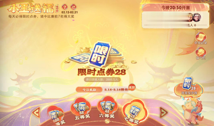 2月12日到21日,每天都可以通过猜比赛名次保底拿到28限时点券,而15到16日参与活动必拿68限时点券,每日通过高级福气码最多可得200限时点券,运气好的话只会拿到更多,欧皇应该已经拿到2888限时点券了。