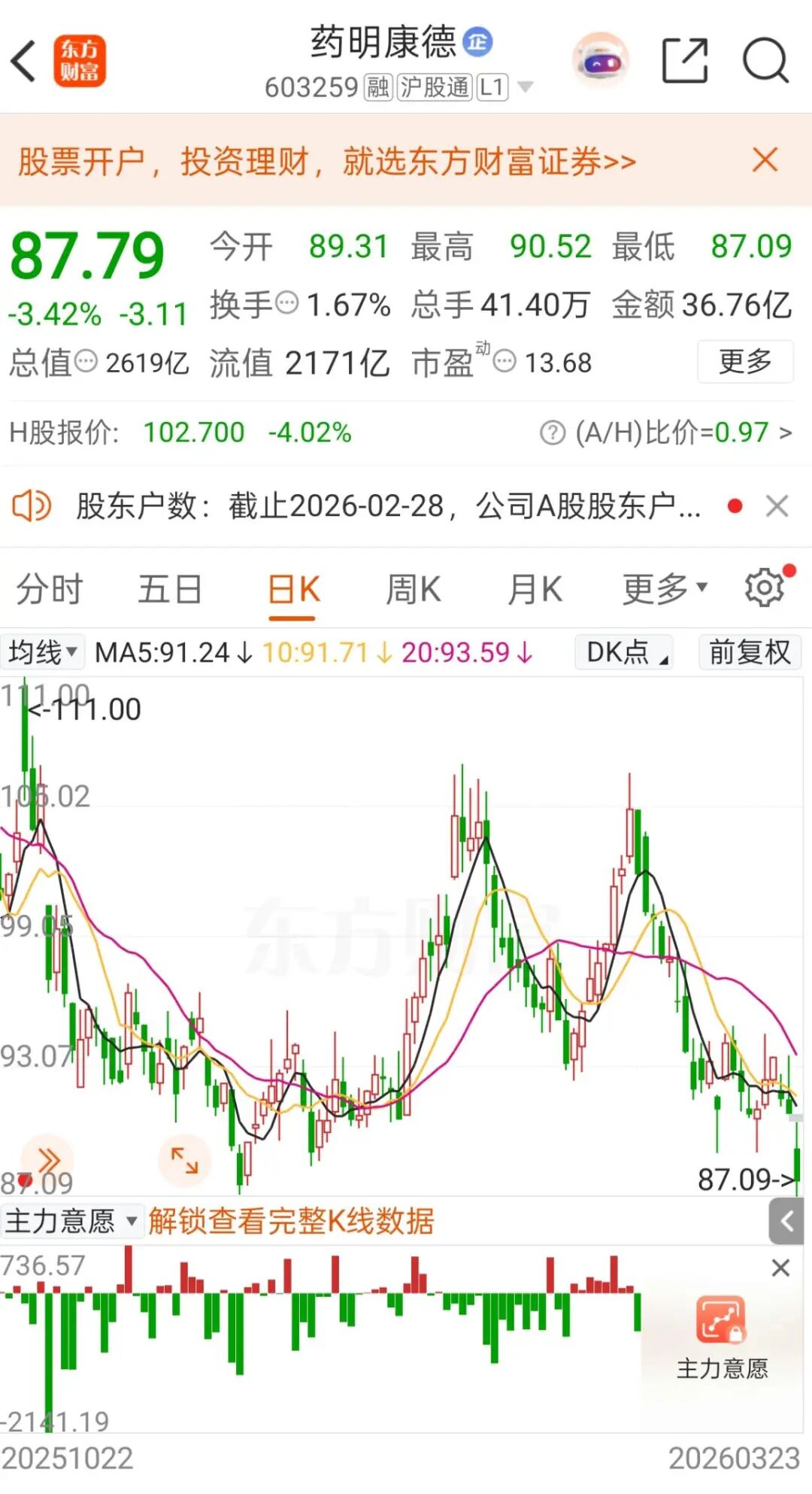 截至3月23日收盘,药明康德A股报87.79元/股,下跌3.42%,总市值为2619亿元。